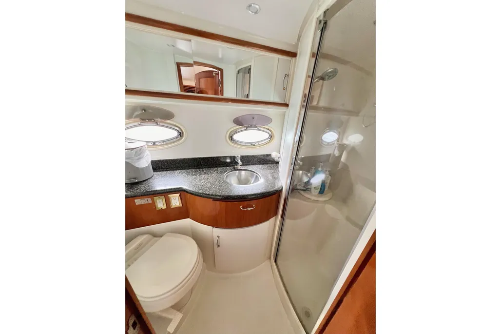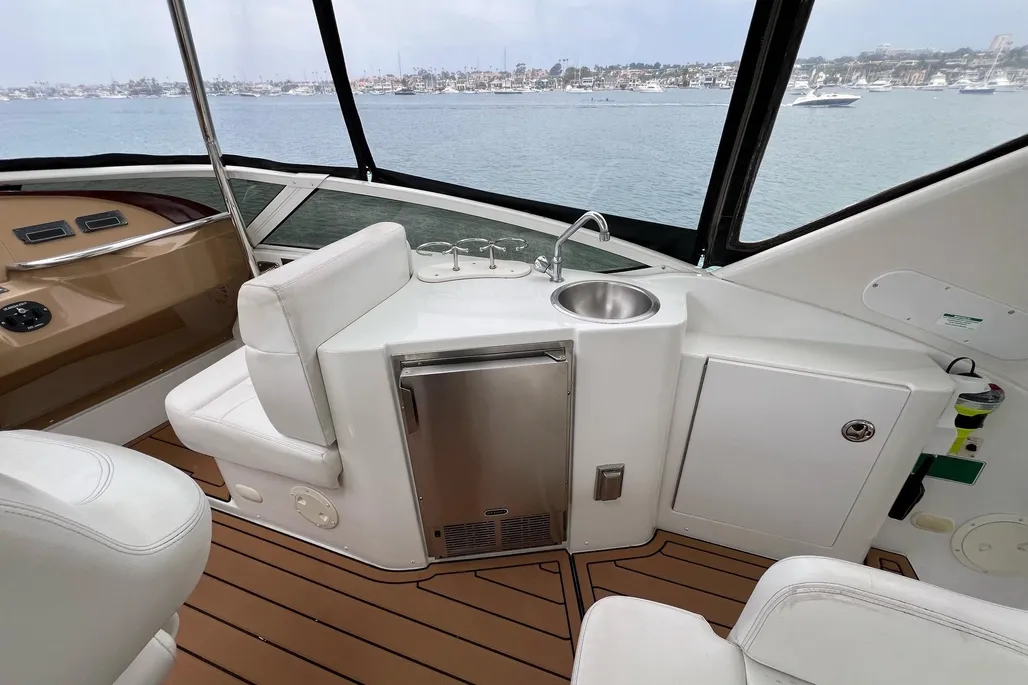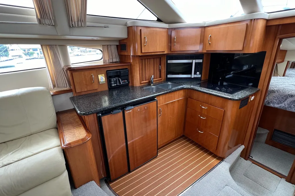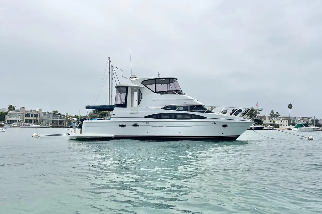 The Carver 444 Cockpit Motor Yacht combines the superb luxury and spaciousness of an aft cabin with exceptional contemporary styling and thoughtful design. Carver’s signature raised walkdeck design also allows for a wider, much roomier cabin than other yachts this size. Combined with the way Carver united the salon and galley into one spacious and elegant “great room”, this adds up to outstanding cruising comfort. The expansive great room features all sorts of amenities, from the sumptuous designer decor and UltraLeather sofa, to the beautiful yet practical solid-surface countertops. When it comes to sleeping accommodations, owners will welcome the unexpected luxury of two private staterooms, each with its own private head compartment. On the bridge, passengers can relax with the L-shaped lounge that seats five and the wetbar that provides convenient bottle storage. The elegant aft deck offers a hardtop that covers the entire deck, plus an electronics arch, and the convenience of an integral bridge stairway and wing doors. For even more fun, the large cockpit offers plenty of space to play.